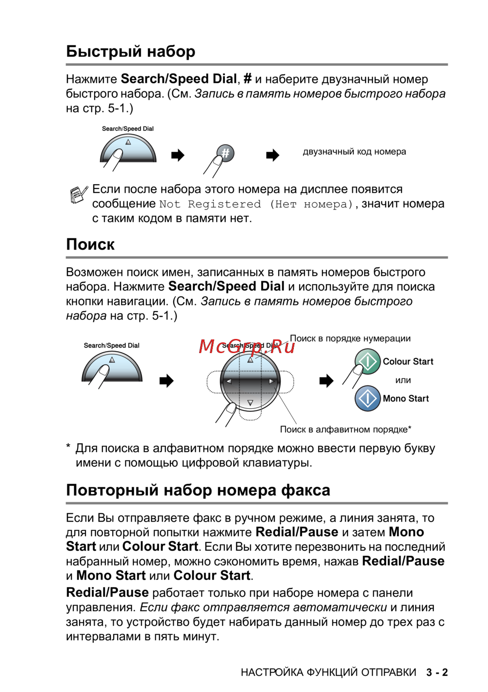 Узнайте, как настроить функции отправки факсов и использовать быстрый набор номеров. Подробные инструкции по поиску и повторному набору.