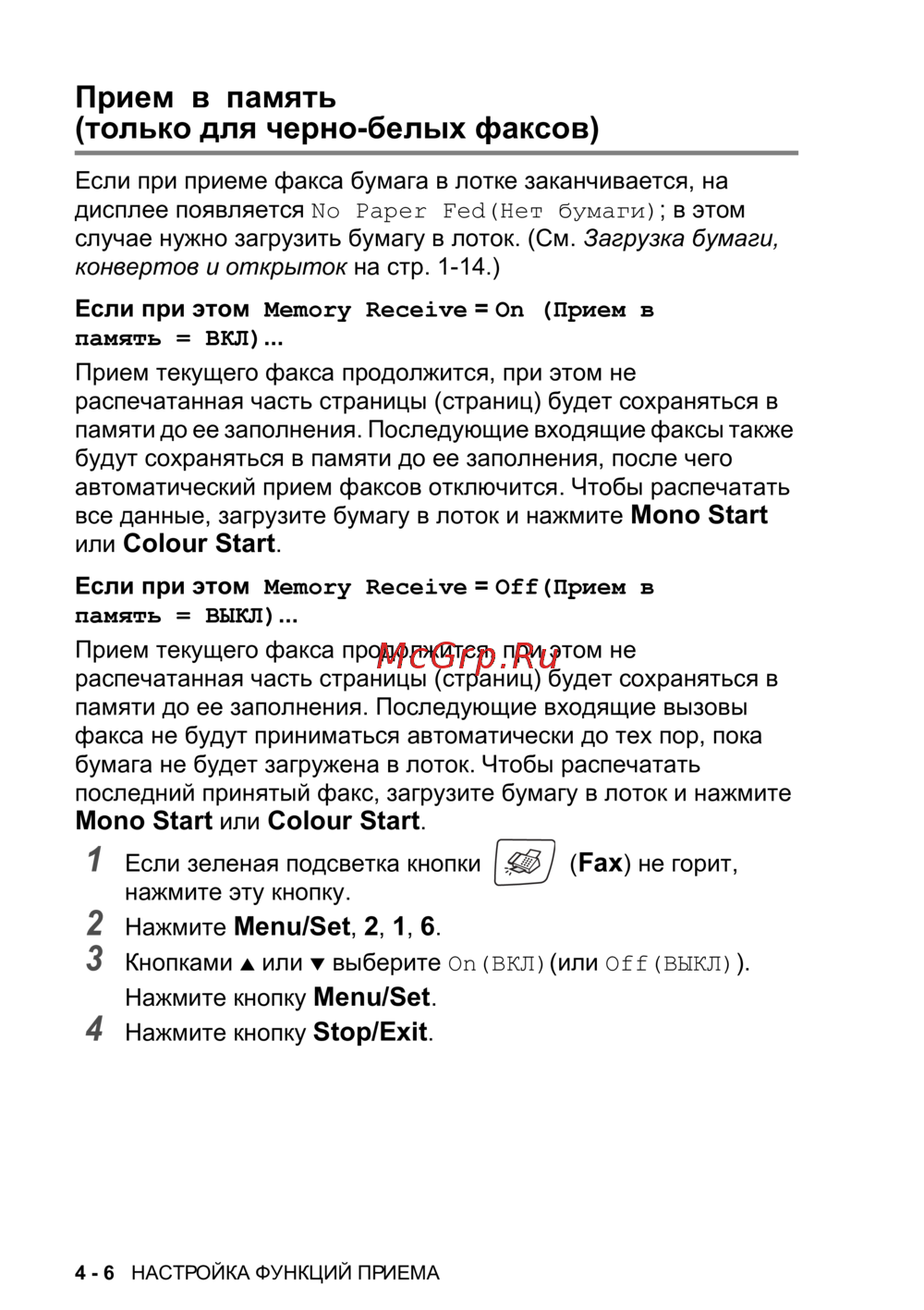 Brother MFC-425CN [68/202] Прием в память только для черно белых факсов