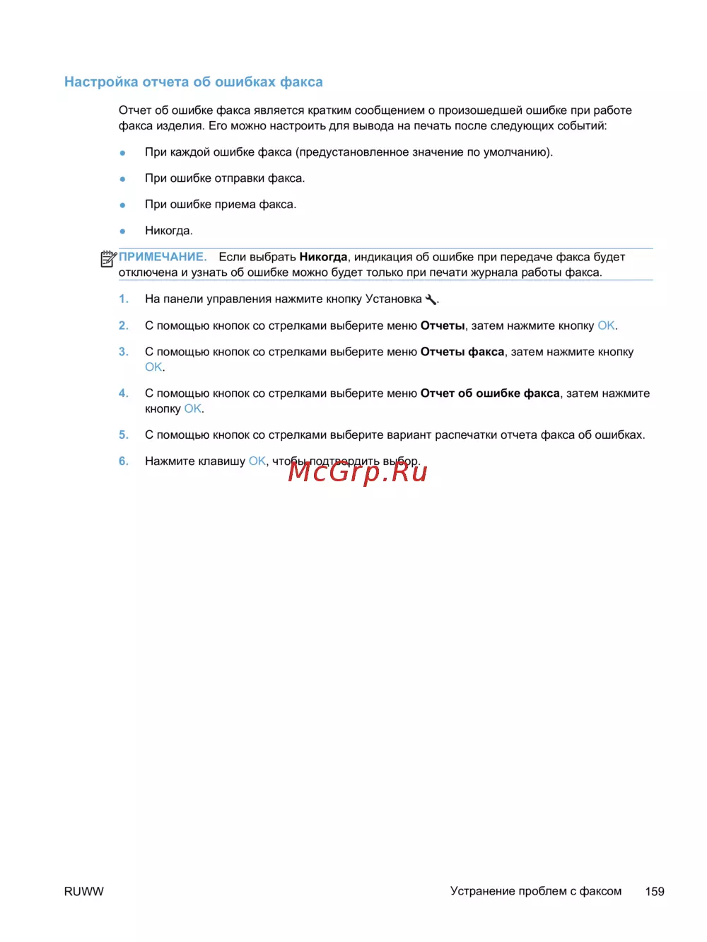 HP LaserJet Pro M1132 — настройка отчета об ошибках факса для эффективной работы [173/314]