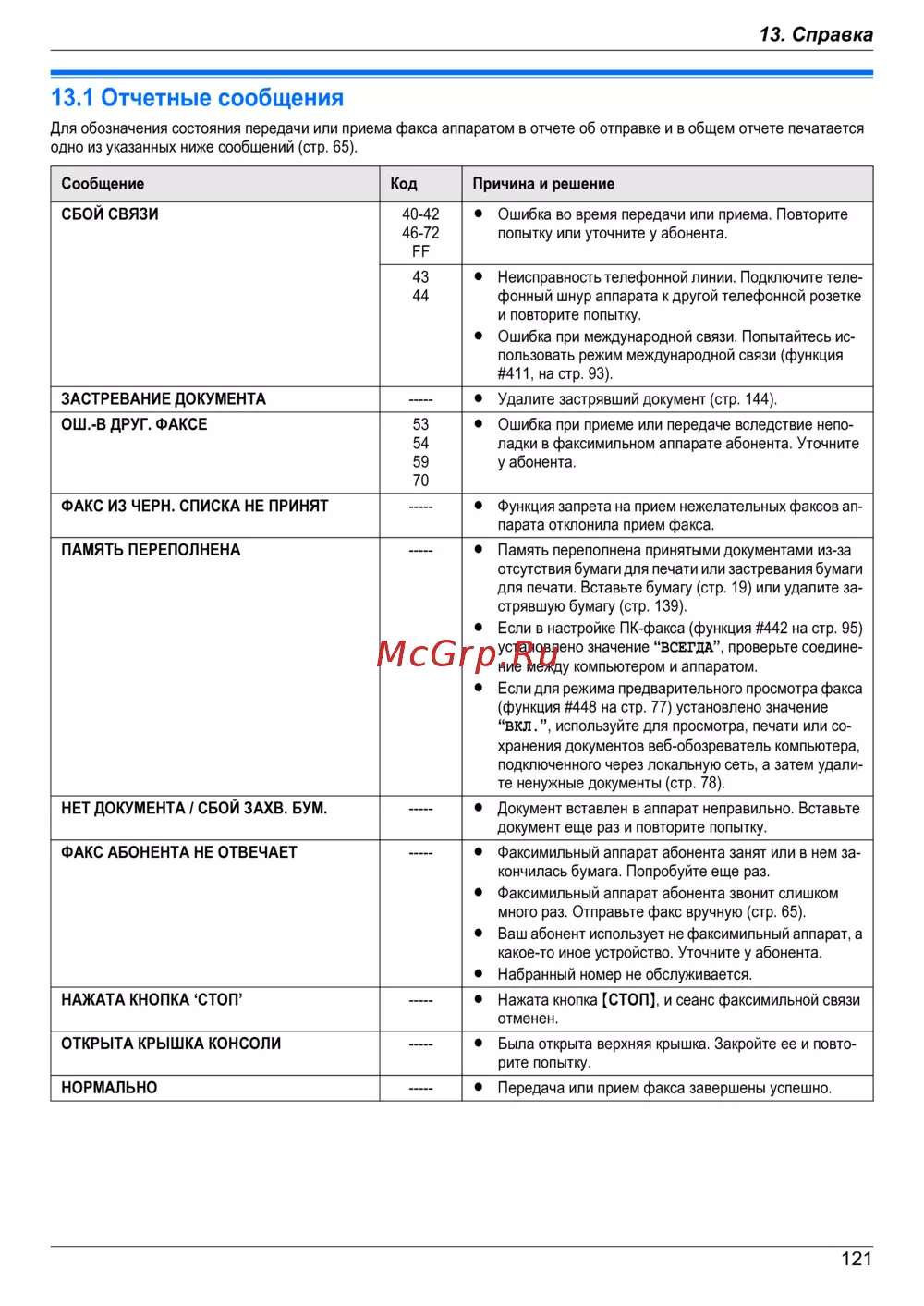 Panasonic KX-MB2051 RU — ошибки и решения при отправке и получении факсов [121/172]