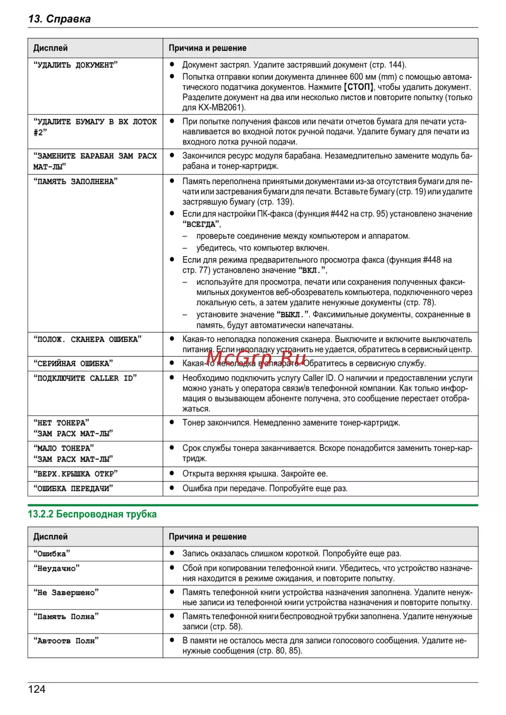 Panasonic KX-MB2051 RU — решение распространенных ошибок принтера и факса [124/172]