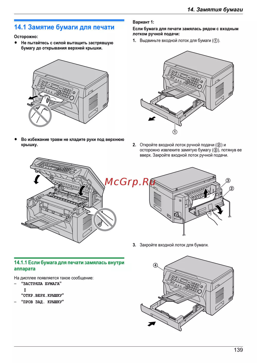 Panasonic KX-MB2051 RU — как правильно устранить замятие бумаги в печатающем устройстве [139/172]