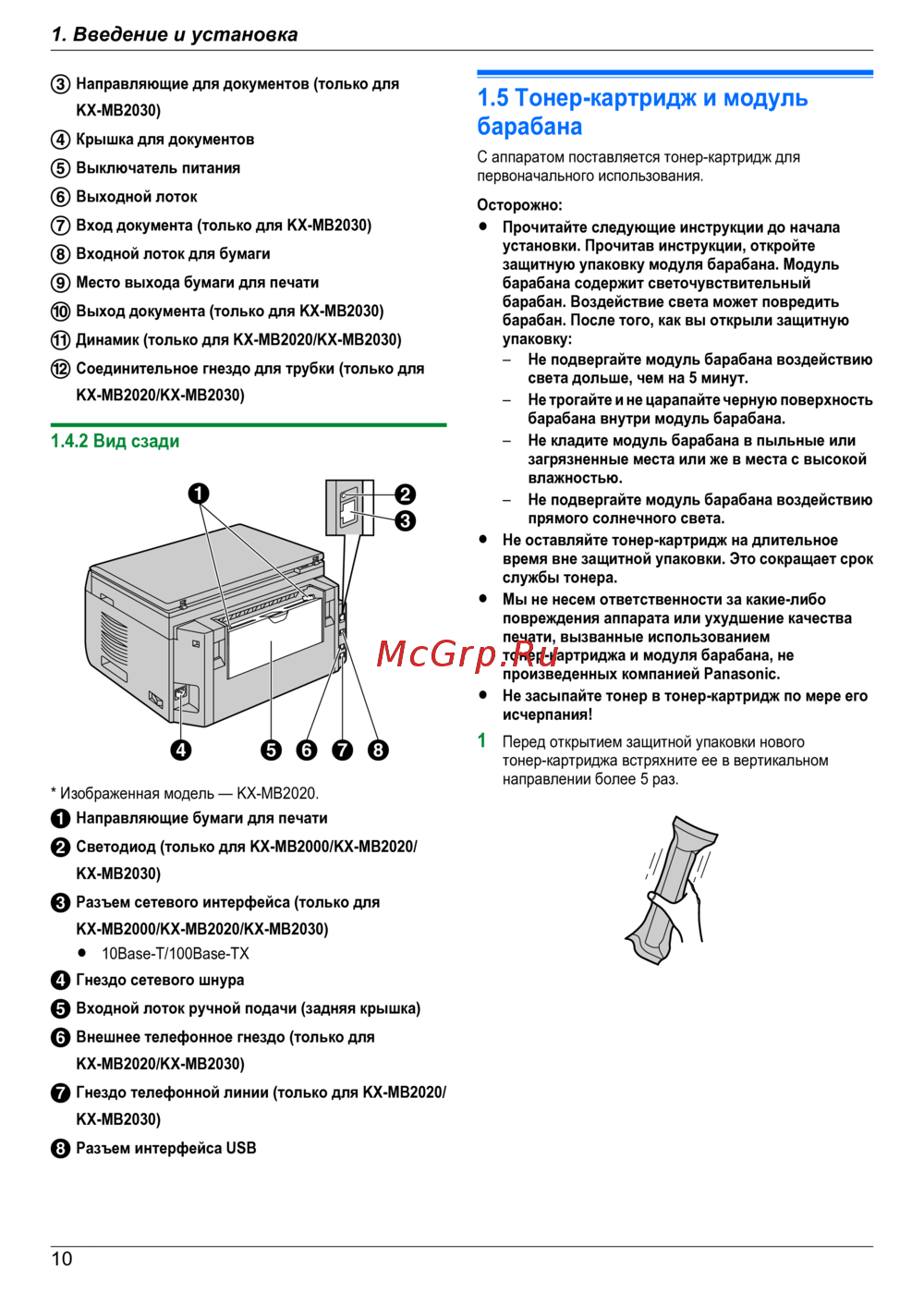 Panasonic KX-MB1900 RU — установка и использование направляющих для документов и тонера [10/132]
