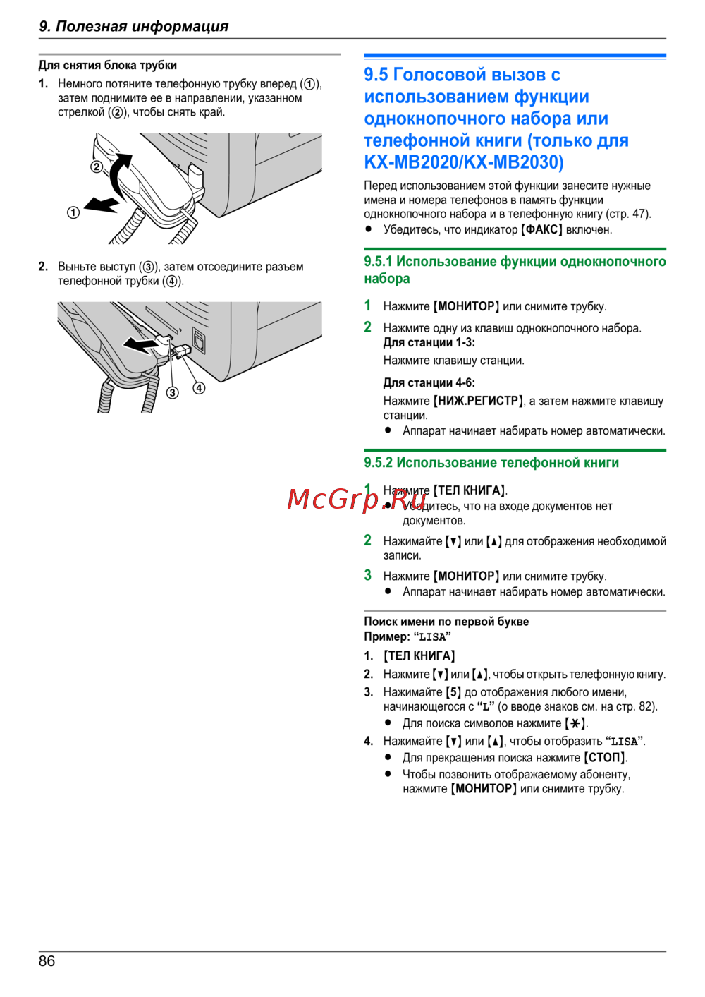 - Голосовой вызов с использованием функции однокнопочного набора или телефонной книги только для kx mb2020 kx mb2030 p.86