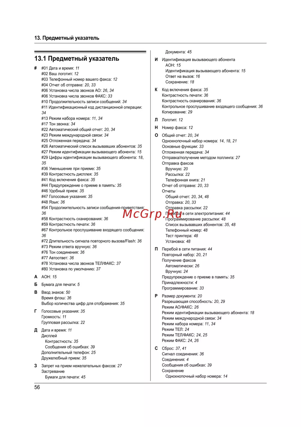 Изучите полный предметный указатель, включая настройки, функции и режимы работы устройства. Удобный доступ к информации о факсах и звонках.