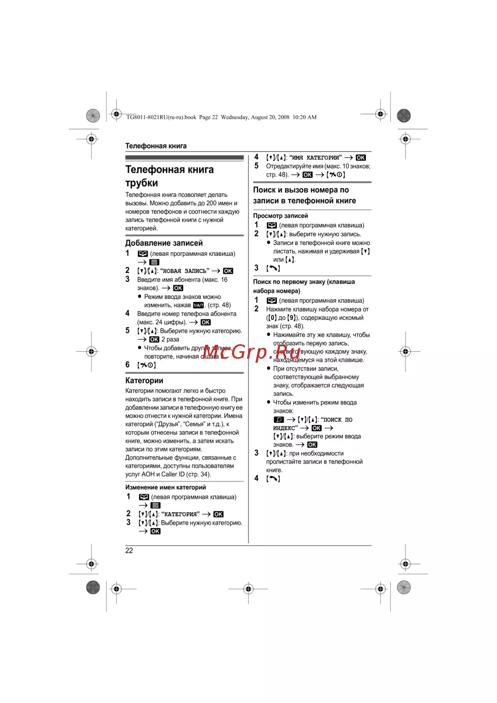 Panasonic KX-TG8012 — телефонная книга: управление записями и категориями [22/60]