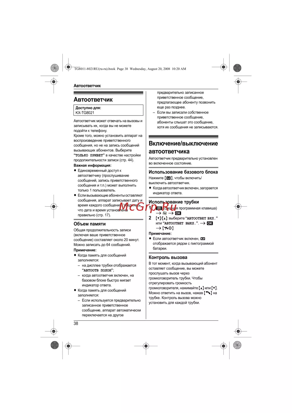 Panasonic KX-TG8012 — автоответчик: управление вызовами и запись сообщений [38/60]