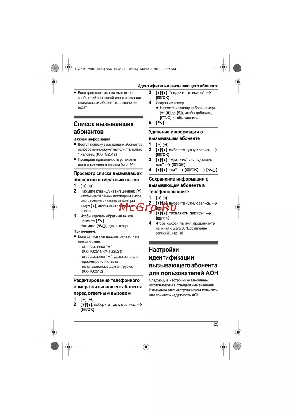 Panasonic KX-TG2511 — идентификация вызывающего абонента: управление и настройки [25/52]