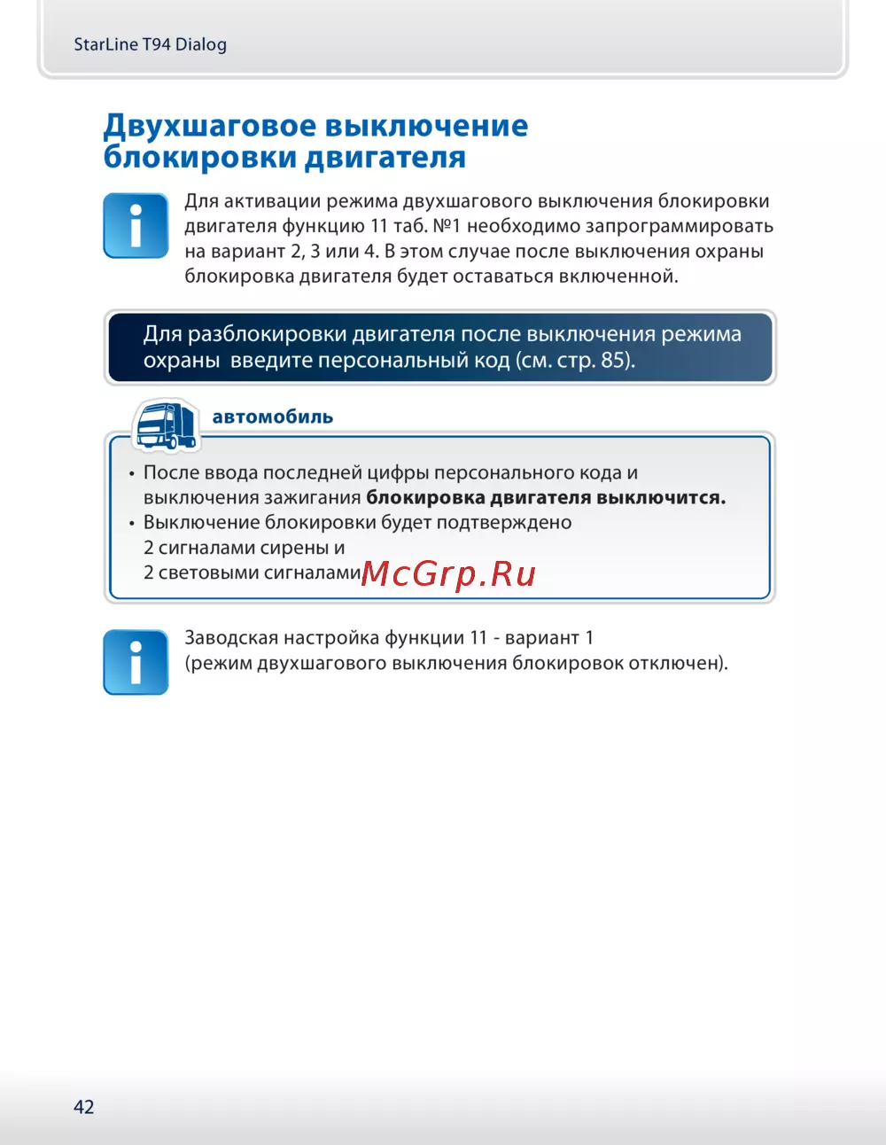 Starline T94 — двухшаговое выключение блокировки двигателя: инструкция и советы [42/104]