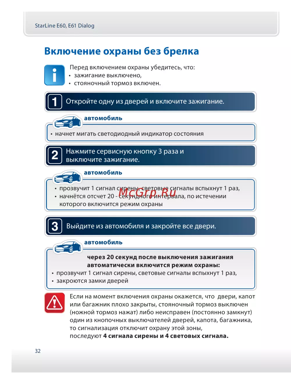 - При закрытии последней двери световые сигналы вспыхнут 1 раз прозвучит 1 короткий сигнал сирены p.29