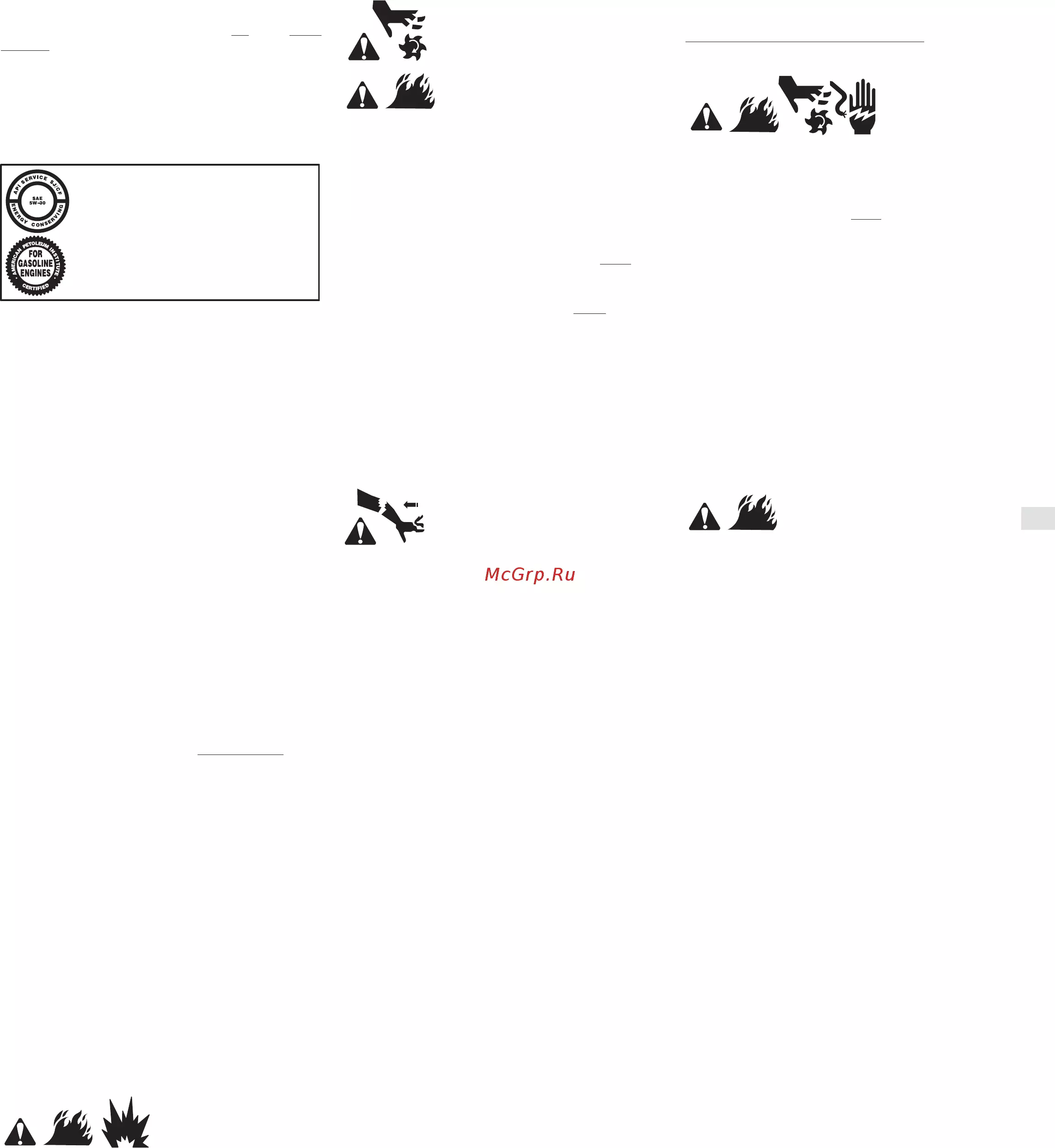 Обслуживание продолжение График обслуживания Хранение В случае хранения двигателей в течение периода более 30 дней Соблюдайте часовые или календарные интервалы Овальный воздушный фильтр Осторожно удалите предварительный фильтр установите предварительный очиститель на патрон топлива Заменить масло 3 После Обслуживания предварительного очистителя и патрона Ненадолго месяцев Очистить эону вокруг глушителя Примечание свечей зажигания только Используйте тестер 1 0 отсутствии свечи дроссель должен который Вы можете заказать топливом в топливном двигатель для баке или прохождения канистре стабилизатора Если стабилизатор не используется или если в положение составлять пока двигатель еще теплый масла FAST мм картера свечу закигания и медленно доверните вал для распределения Очистка камеры сгорания 3 Очистите цилиндр и ребра головки цилиндра пространство В случае работы в пыльных условиях наличия мусора в 0 76 из 1 2 унции моторного масла в цилиндр Вновь установите Каждые 100 300 часов зажигания масло 2 Выньте свечу зажигания и залейте приблизительно 15 мл Осмотреть искроуловитель если имеется зажигания Stratton SAE см рис 21 Заменить масло воздухе свечи с Слейте Каждые 50 часов или каждый сезон зажигания быстро и заводите до тех пор пока двигатель не запустится Зазор или Заполните свежим маслом рекомндуемой степени вязкости Briggs Stratton О для установите избежание системе двигатель до остановки из за нехватки топлива Обслуживание воздушного фильтра проверки искры перелива во бензоспирте необходимо слить все топливо из бака и запустить НЕ проверяйте искру с вынутой случае топливной двигатель работает на топливе с содержанием спирта например Каждые 25 часов или каждый сезон высокой температуре окружающей среды В топливо в через карбюратор Двигатель и топливо могут храниться до 24 Заменить масло при работе с высокой нагрузкой или при при заведите Удалите мусор винтами к основанию Обслуживание свечи зажигания см рис 9 Briggs стабилизатор Проверить уровень масла 5 Установите крышку воздушного фильтра и плотно закрепите двигатель слить у Уполномоченного Сервисного Дилера Briggs Stratton Размешайте Каждые 5 часов или ежедневно 4 Установите патрон предварительный фильтр в основание заводите или осадков Для защиты двигателя мы рекомендуем использовать стабилизатор Первые 5 часов если установлен и патрон О НЕ защитить смолистых на основных частях карбюратора необходимо производить обслуживание чаще их образования раньше В случае работы в неблагоприятных условиях 1 Отверните винты О и поднимите крышку О 2 необходимо обслуживания в зависимости от того какие из них истекут или 0 030 дюйма а также после продолжительного под кожухом стартера и вокруг глушителя от травы и мусора кошения 4 Хранить в чистом и сухом помещении но НЕ рядом с печью высокой и сухой травы необходимо производить очистку котлом более часто горелка или любым иным оборудованием которое может В случае установки двигателя на травокосилках или водонагревателем в которых используется произвести искру триммерах Заменяйте свечу зажигания через каждые 100 часов работы или каждый сезон в зависимости от того что истечет наступит раньше Тестер зажигания и ключ для свечи зажигания можно заказать у любого Уполномоченного Примечание в использования Сервисного некоторых Дилера районах