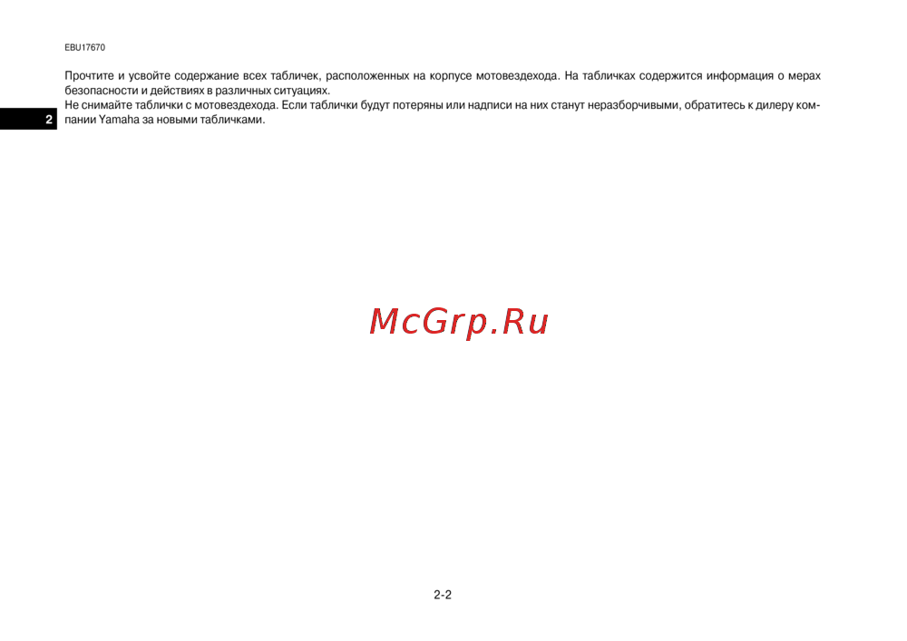 Прочтите и усвойте содержание всех табличек, расположенных на корпусе мотовездехода. На табличках содержится информация о мерах