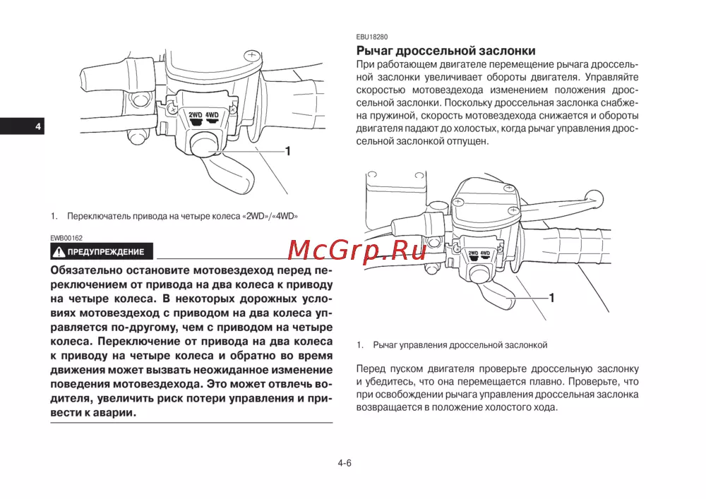 - Обязательно остановите мотовездеход перед пе реключением от привода на два колеса к приводу на четыре колеса в некоторых дорожных усло виях мотовездеход с приводом на два колеса уп равляется по другому чем с приводом на четыре колеса переключение от привода на два колеса к приводу на четыре колеса и обратно во время движения может вызвать неожиданное изменение поведения мотовездехода это может отвлечь во дителя увеличить риск потери управления и при вести к аварии p.24