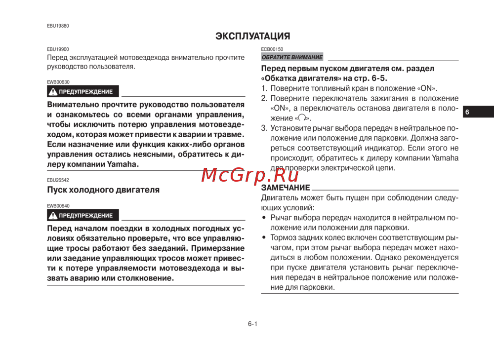 - Эксплуатировать мотовездеход следует только в зоне с соответствующей вентиляцией запреща ется пускать двигатель или оставлять двигатель работающим в закрытом помещении ядовитые выхлопные газы могут за короткое время привес ти к потере сознания и смерти p.13
