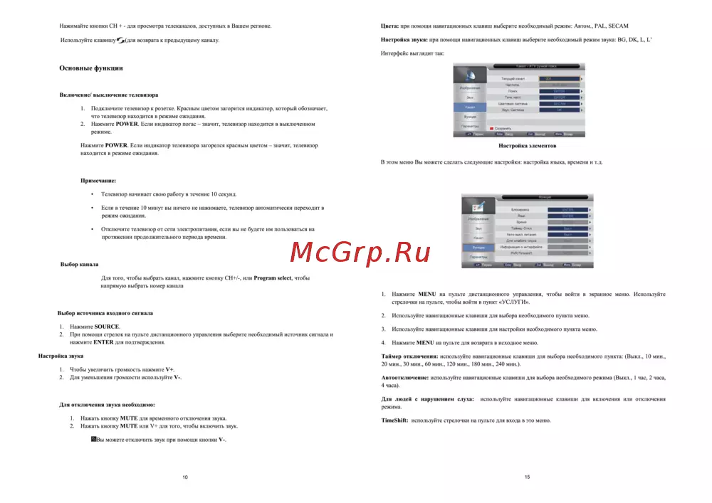Нажимайте кнопки СН для просмотра телеканалов доступных в Вашем регионе Цвета при помощи навигационных клавиш выберите необходимый режим Автом PAL SECAM Используйте клавишу дня возврата к предыдущему каналу Настройка звука при помощи навигационных клавиш выберите необходимый режим звука ВС ЭК Ь Ь Интерфейс выглядит так Основные функции Включение выключение телевизора 1 Подключите телевизор к розетке Красным цветом загорится индикатор который обозначает что телевизор находится в режиме ожидания 2 Нажмите POWER Если индикатор погас значит телевизор находится в выключенном режиме Нажмите POWER Если индикатор телевизора загорелся красным цветом значит телевизор находится в режиме ожидания Настройка элементов В этом меню Вы можете сделать следующие настройки настройка языка времени и т д Примечание Телевизор начинает свою работу в течение 10 секунд Если в течение 10 минут вы ничего не нажимаете телевизор автоматически переходит в режим ожидания Отключите телевизор от сети электропитания если вы не будете им пользоваться на протяжении продолжительного периода времени Выбор канала Для того чтобы выбрать канал нажмите кнопку СН или Program select чтобы напрямую выбрать номер канала 1 Нажмите MENU на пульте дистанционного управления чтобы войти в экранное меню Используйте стрелочки на пульте чтобы войти в пункт УСЛУГИ Выбор ист очника входного сигнала 2 Используйте навигационные клавиши для выбора необходимого пункта меню 1 Нажмите SOURCE 2 При помощи стрелок на пульте дистанционного управления выберите необходимый источник сигнала и нажмите ENTER для подтверждения Настройка звука 3 Используйте навигационные клавиши для настройки необходимого пункта меню 4 Нажмите MENU на пульте для возврата в исходное меню Таймер отключения используйте навигационные клавиши для выбора необходимого пункта Выкл 10 мин 20 мин 30 мин 60 мин 120 мин 180 мин 240 мин 1 Чтобы увеличить громкость нажмите V 2 Для уменьшения громкости используйте V Автоотключение используйте навигационные клавиши для выбора необходимого режима Выкл 1 час 2 часа 4 часа Для людей с нарушением слуха используйте навигационные клавиши для включения или отключения режима Для отключения звука необходимо 1 Нажать кнопку MUTE для временного отключения звука 2 Нажать кнопку MUTE или V для того чтобы включить звук TimcShift используйте стрелочки на пульте для входа в это меню 0Вы можете отключить звук при помощи кнопки V 10 15