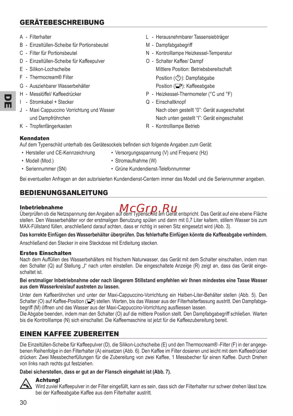 bis die Kontrolllampe (N) sich einschaltet. Die Kaffeemaschine ist jetzt für die Kaffeezubereitung bereit.