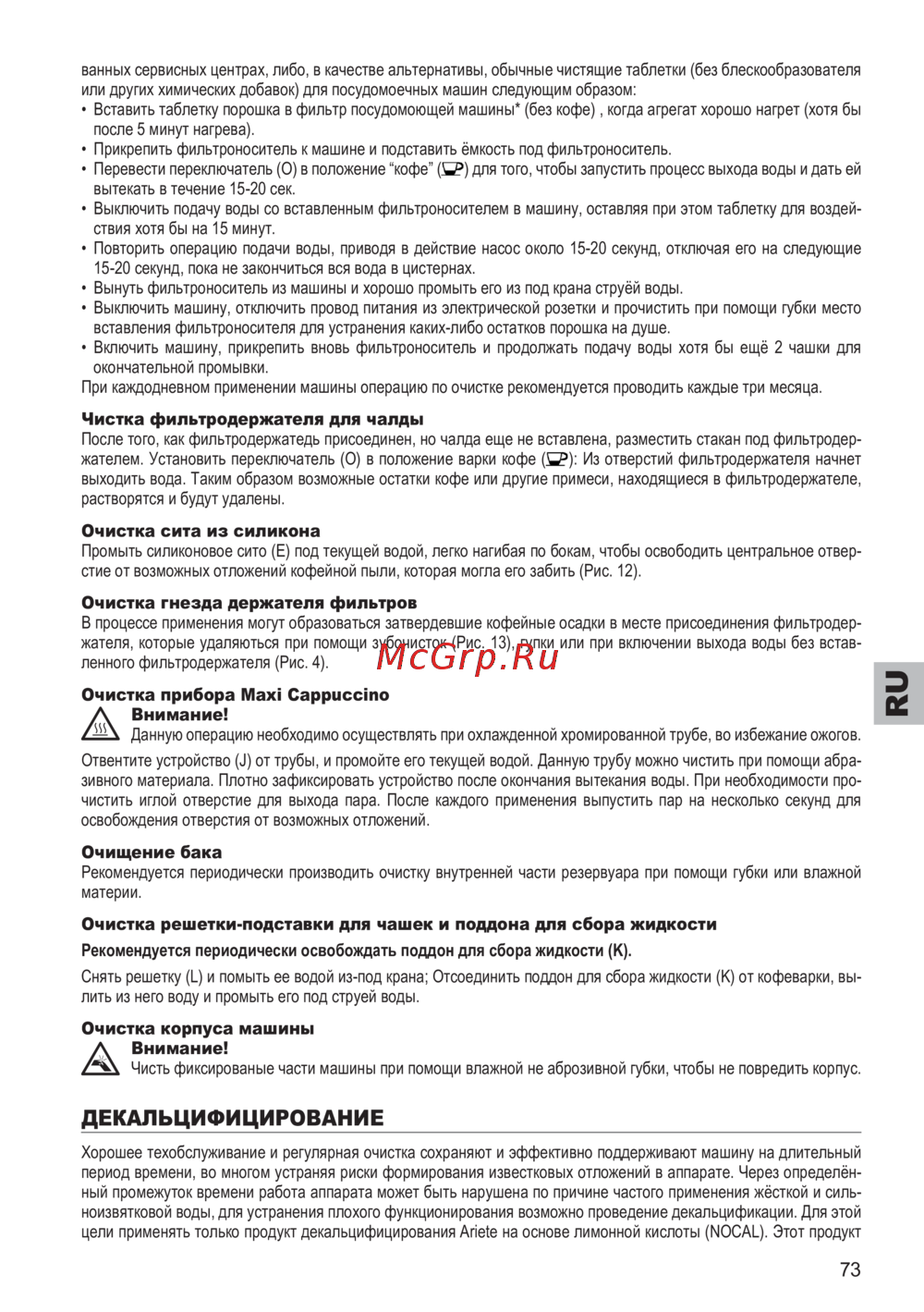 цели применять только продукт декальцифицирования Ariete на основе лимонной кислоты (NOCAL). Этот продукт