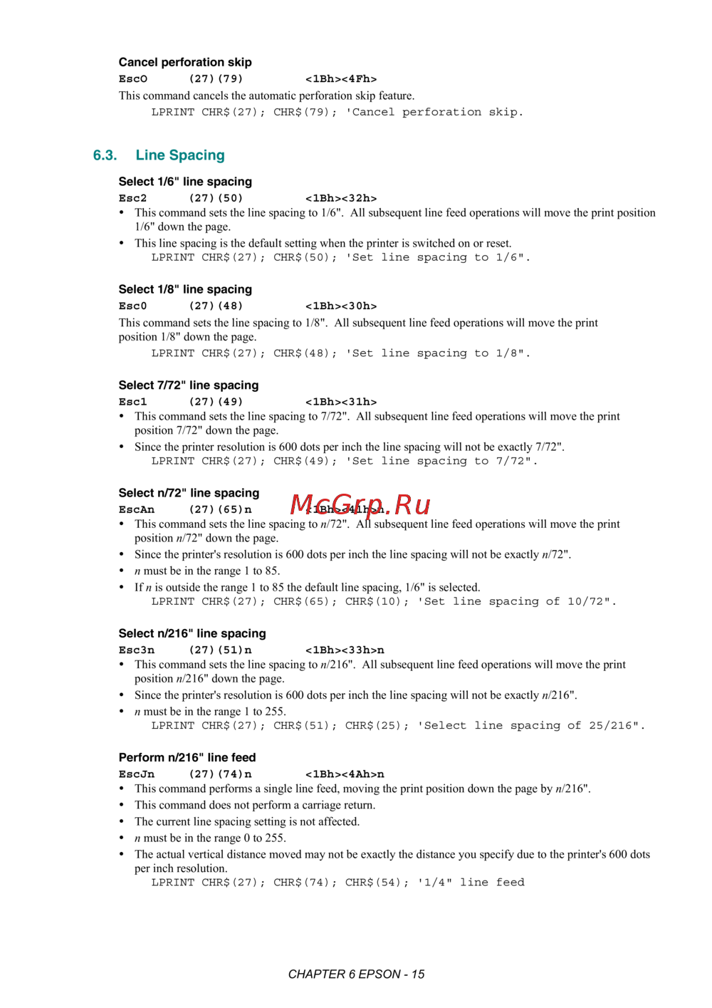 This command sets the line spacing to 1/6". All subsequent line feed operations will move the print position