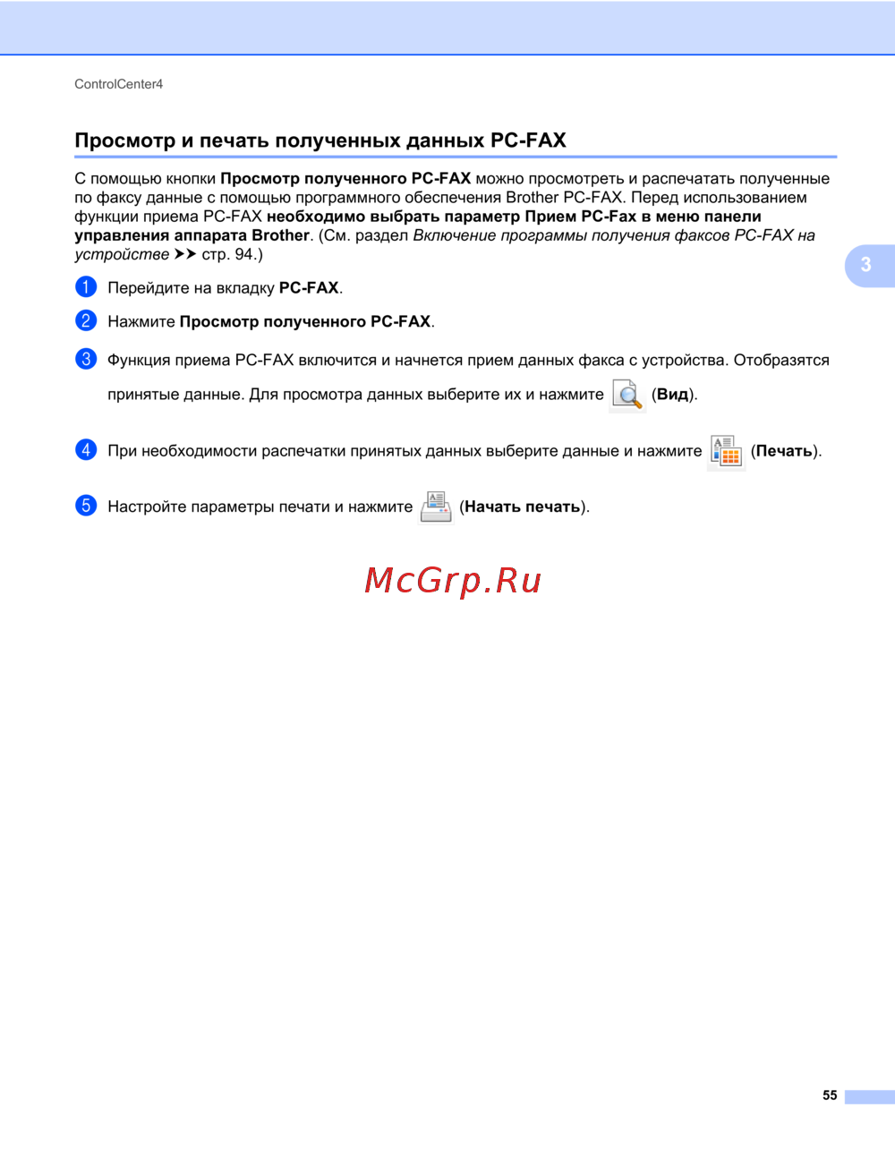 Просмотр и печать полученных данных PC-FAX 3