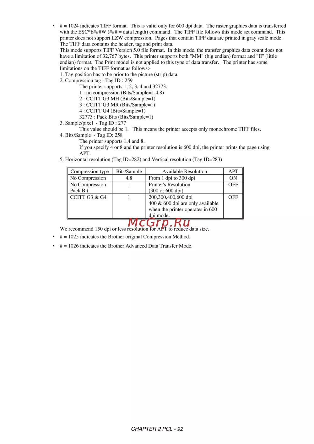 with the ESC*b###W (### = data length) command. The TIFF file follows this mode set command. This