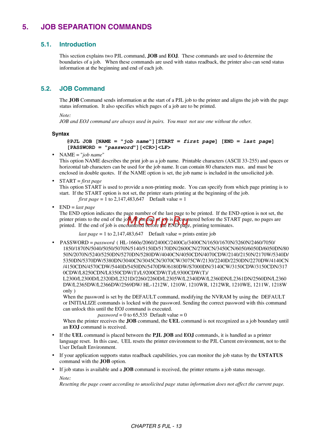 This section explains two PJL command, JOB and EOJ. These commands are used to determine the