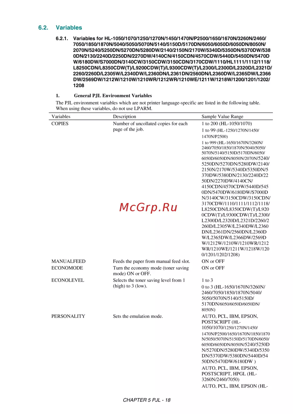 6.2.1. Variables for HL-1050/1070/1250/1270N/1450/1470N/P2500/1650/1670N/3260N/2460/