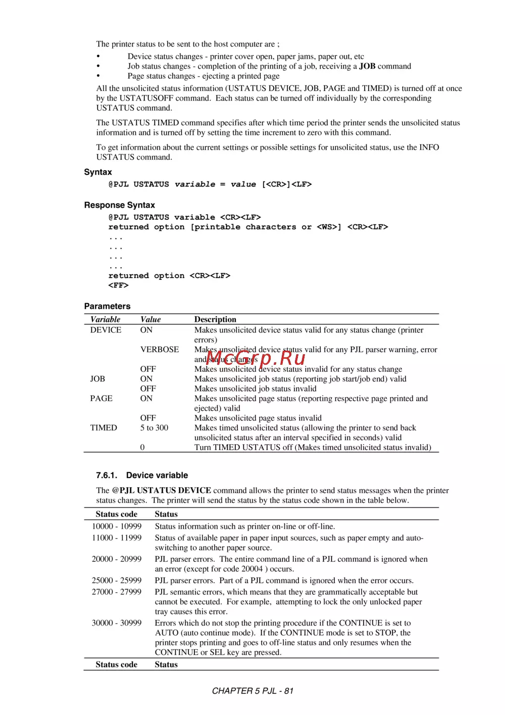 The @PJL USTATUS DEVICE command allows the printer to send status messages when the printer