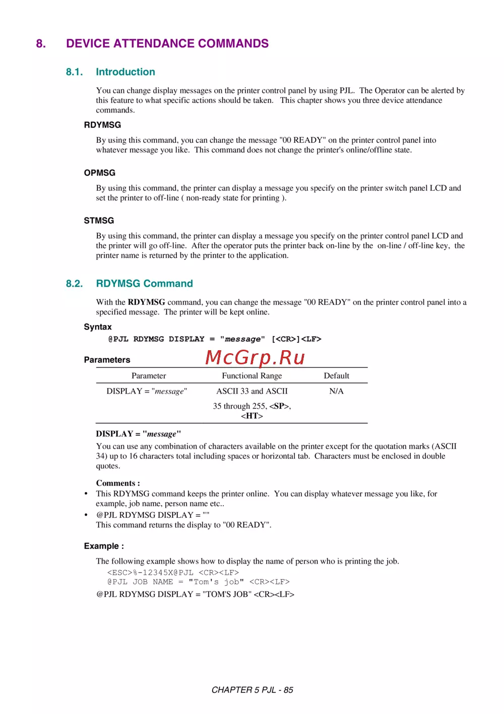 @PJL RDYMSG DISPLAY = "message" [<CR>]<LF>