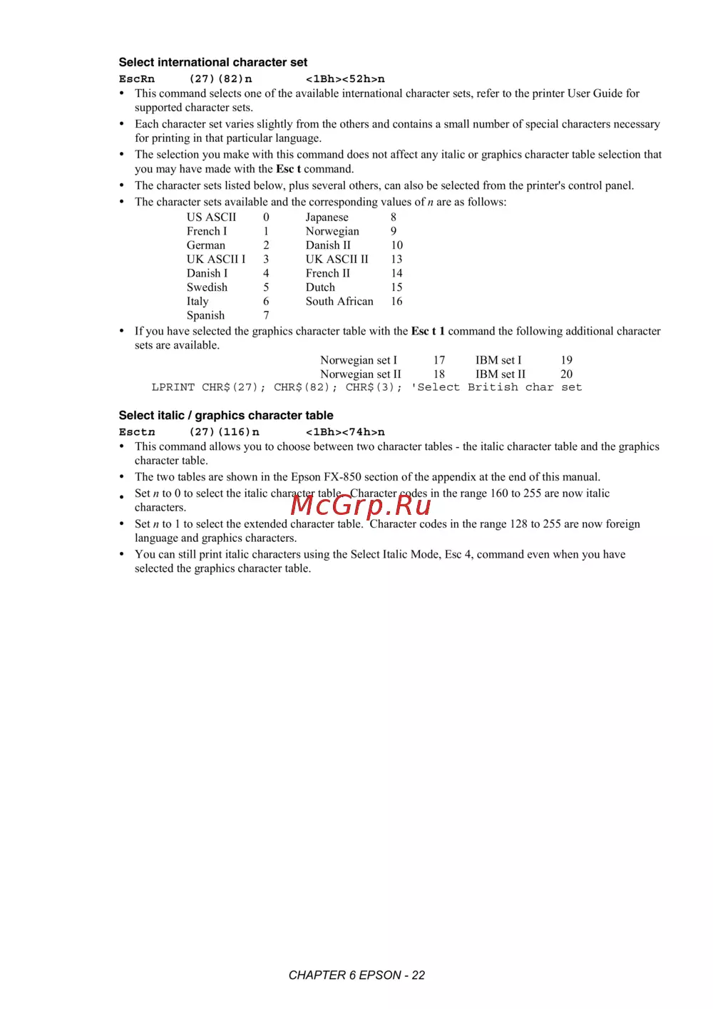 This command selects one of the available international character sets, refer to the printer User Guide for