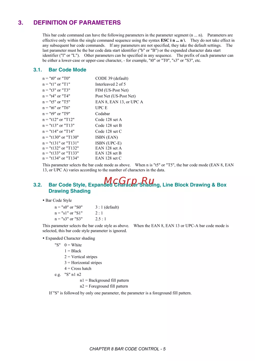 This parameter selects the bar code mode as above. When n is "t5" or "T5", the bar code mode (EAN 8, EAN