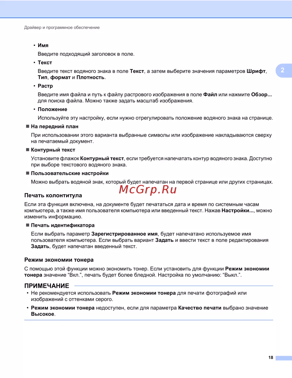 Узнайте, как настроить водяные знаки, печать колонтитулов и режим экономии тонера для документов. Оптимизируйте печать с помощью простых шагов.