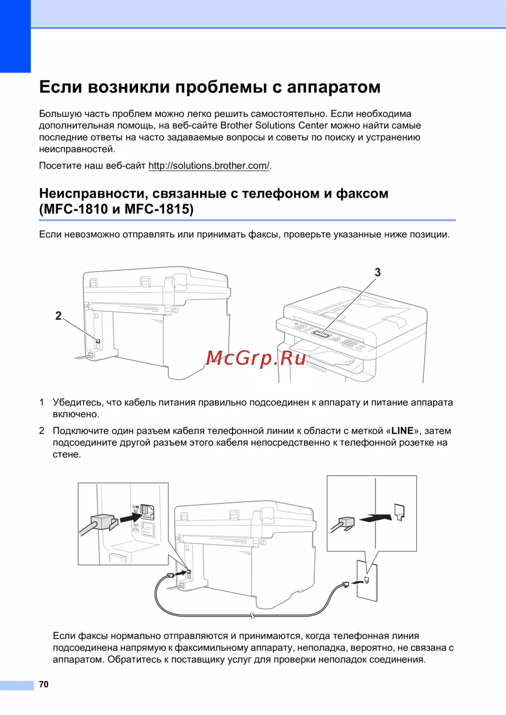 - Если после принятия всех указанных выше мер отправка и прием факсов все равно невозможны просмотрите часто задаваемые вопросы на веб сайте brother solutions center http solutions brother com p.79