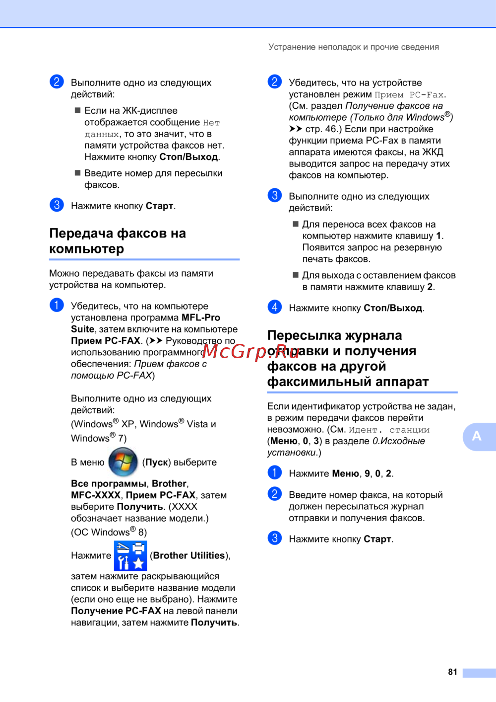 - Перевод на другой аппарат факсов или журнала факса mfc 1810 и mfc 1815 p.88