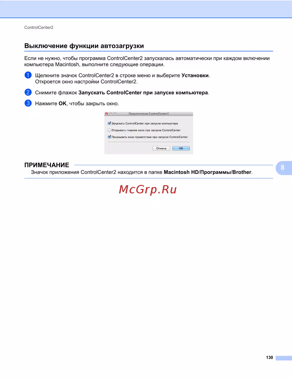 Значок приложения ControlCenter2 находится в папке Macintosh HD/Программы/Brother.