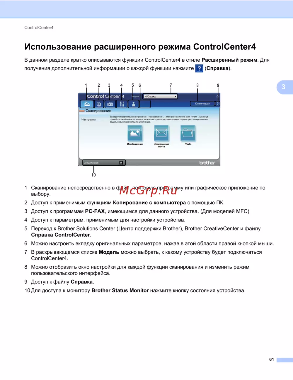 Узнайте о функциях расширенного режима ControlCenter4, включая сканирование, копирование и доступ к настройкам устройства. Получите максимум от вашего программного обеспечения.