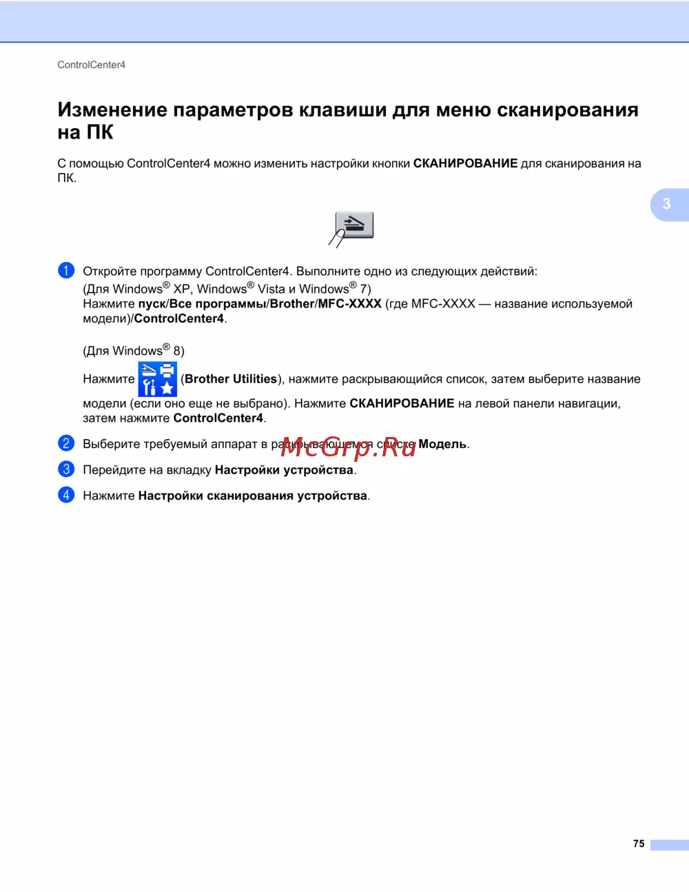 С помощью ControlCenter4 можно изменить настройки кнопки СКАНИРОВАНИЕ для сканирования на