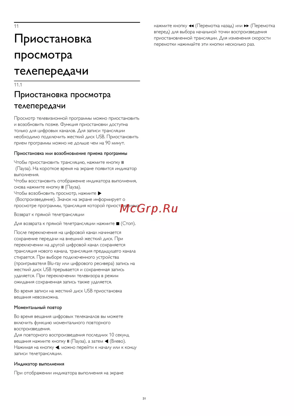 Узнайте, как приостановить и возобновить просмотр телепередач на цифровых каналах, а также использовать функции записи и моментального повтора.