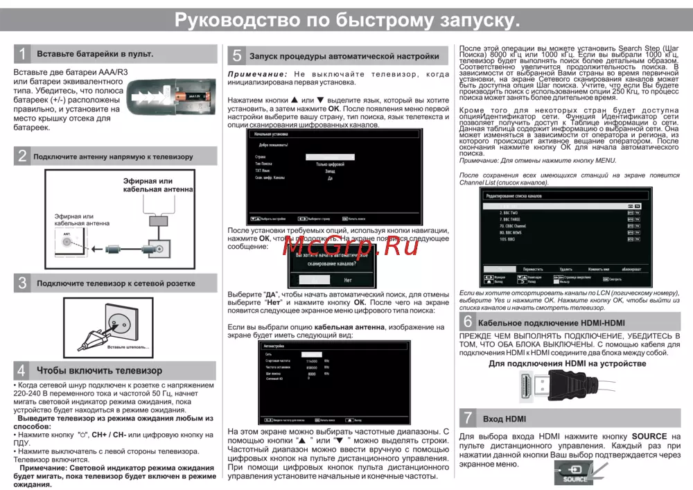 Руководство по быстрому запуску Вставьте батарейки в пульт Вставьте две батареи AAA R3 или батареи эквивалентного типа Убедитесь что полюса батареек расположены правильно и установите на место крышку отсека для батареек Запуск процедуры автоматической настройки Примечание Не выключайте инициализирована первая установка телевизор когда Нажатием кнопки или выделите язык который вы хотите установить а затем нажмите ОК После появления меню первой настройки выберите вашу страну тип поиска язык телетекста и После этой операции вы можете установить Search Step Шаг Поиска 8000 кГц или 1000 кГц Если вы выбрали 1000 кГц телевизор будет выполнять поиск более детальным образом Соответственно увеличится продолжительность поиска В зависимости от выбранной Вами страны во время первичной установки на экране Сетевого сканирования каналов может быть доступна опция Шаг поиска Учтите что если Вы будете производить поиск с использованием опции 250 Кгц то процесс поиска может занять более длительное время Кроме того для некоторых стран будет доступна опцияИдентификатор сети Функция Идентификатор сети позволяет получить доступ к Таблице информации о сети Данная таблица содержит информацию о выбранной сети Она может изменяться в зависимости от оператора и региона из которого происходит активное вещание оператором После окончания нажмите кнопку ОК для начала автоматического поиска Примечание Для отмены нажмите кнопку MENU После сохранения всех имеющихся станций на экране появится Channel List список каналов После установки требуемых опций используя кнопки навигации нажмите ОК чтобы продолжить На экране появится следующее сообщение Вы хотите начать автоматическое сканирование каналов Подключите телевизор к сетевой розетке Выберите ДА чтобы начать автоматический поиск для отмены выберите Нет и нажмите кнопку ОК После чего на экране появится следующее экранное меню цифрового типа поиска Если вы выбрали опцию кабельная антенна изображение на экране будет иметь следующий вид Кабельное подключение HDMI HDMI ПРЕЖДЕ ЧЕМ ВЫПОЛНЯТЬ ПОДКЛЮЧЕНИЕ УБЕДИТЕСЬ В ТОМ ЧТО ОБА БЛОКА ВЫКЛЮЧЕНЫ С помощью кабеля для подключения HDMI к HDMI соедините два блока между собой Для подключения HDMI на устройстве Чтобы включить телевизор Когда сетевой шнур подключен к розетке с напряжением 220 240 В переменного тока и частотой 50 Гц начнет мигать световой индикатор режима ожидания пока устройство будет находиться в режиме ожидания Выведите телевизор из режима ожидания любым из способов Нажмите кнопку О СН СН или цифровую кнопку на ПДУ Нажмите выключатель с левой стороны телевизора Телевизор включится Примечание Световой индикатор режима ожидания будет мигать пока телевизор будет включен в режиме ожидания Если вы хотите отсортировать каналы по L CN логическому номеру выберите Yes и нажмите ОК Нажмите кнопку ОК чтобы выйти из списка каналов и начать смотреть телевизор Вход HDMI На этом экране можно выбирать частотные диапазоны С помощью кнопки А или можно выделять строки Частотный диапазон можно ввести вручную с помощью цифровых кнопок на пульте дистанционного управления При помощи цифровых кнопок пульта дистанционного управления установите начальные и конечные частоты Для выбора входа HDMI нажмите кнопку SOURCE на пульте дистанционного управления Каждый раз при нажатии данной