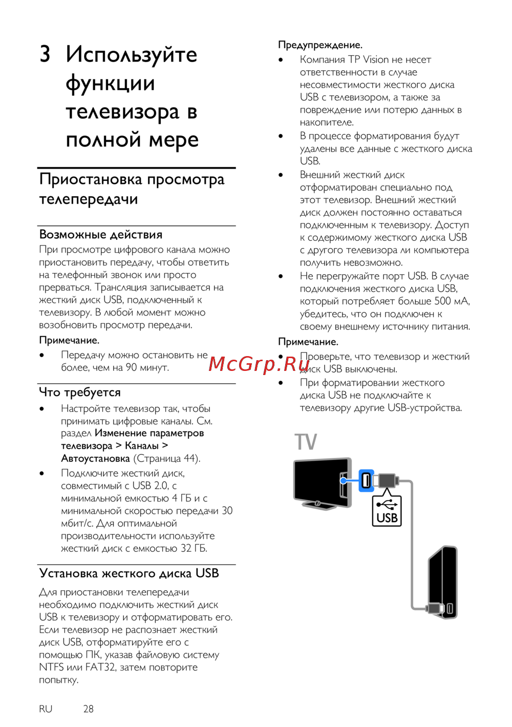 Узнайте, как приостановить просмотр телепередачи и записать её на жесткий диск USB. Настройте телевизор для цифровых каналов и подключите совместимый диск.