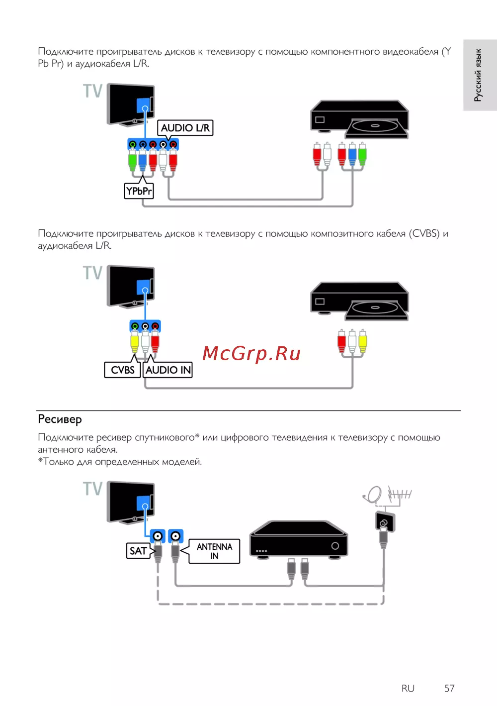 - Подключите ресивер спутникового или цифрового телевидения к телевизору с помощью антенного кабеля только для определенных моделей p.57