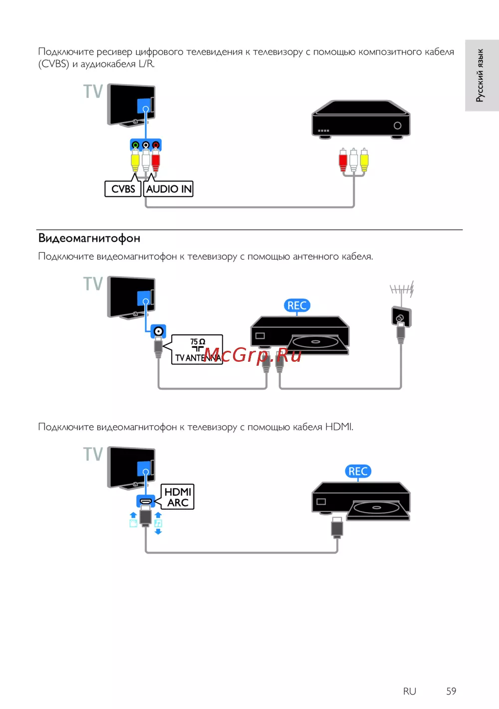 - Подключите ресивер цифрового телевидения к телевизору с помощью композитного кабеля cvbs и аудиокабеля l r p.59