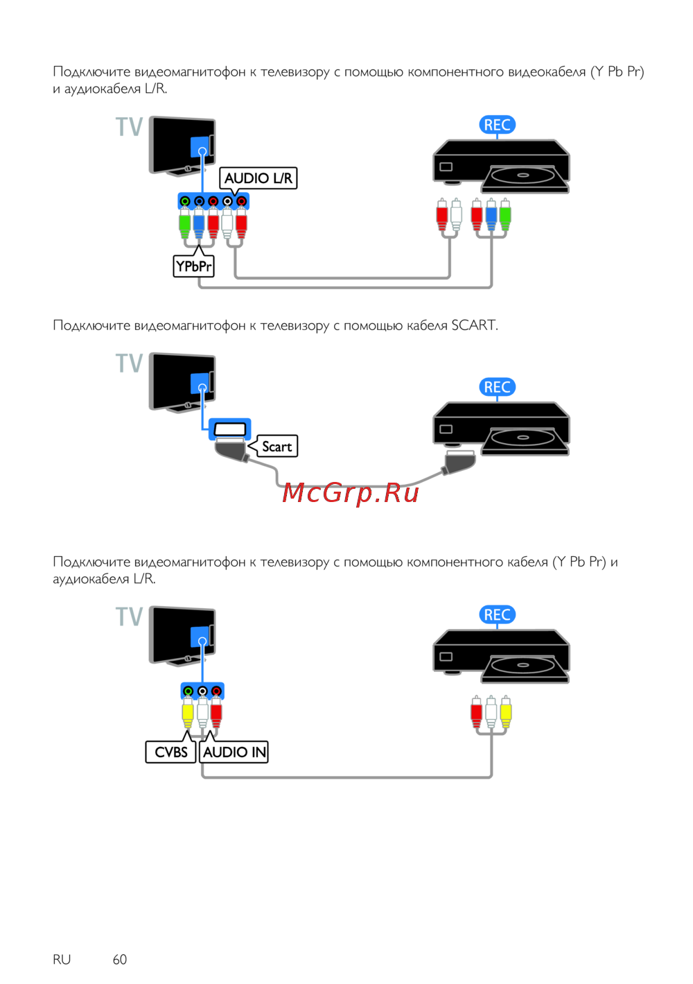 - Подключите видеомагнитофон к телевизору с помощью компонентного кабеля y pb pr и подключите видеомагнитофон к телевизору с помощью компонентного кабеля y pb pr и аудиокабеля l r p.60