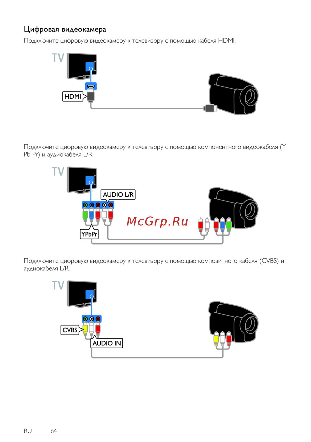 - Подключите видеомагнитофон к телевизору с помощью компонентного кабеля y pb pr и подключите видеомагнитофон к телевизору с помощью компонентного кабеля y pb pr и аудиокабеля l r p.60