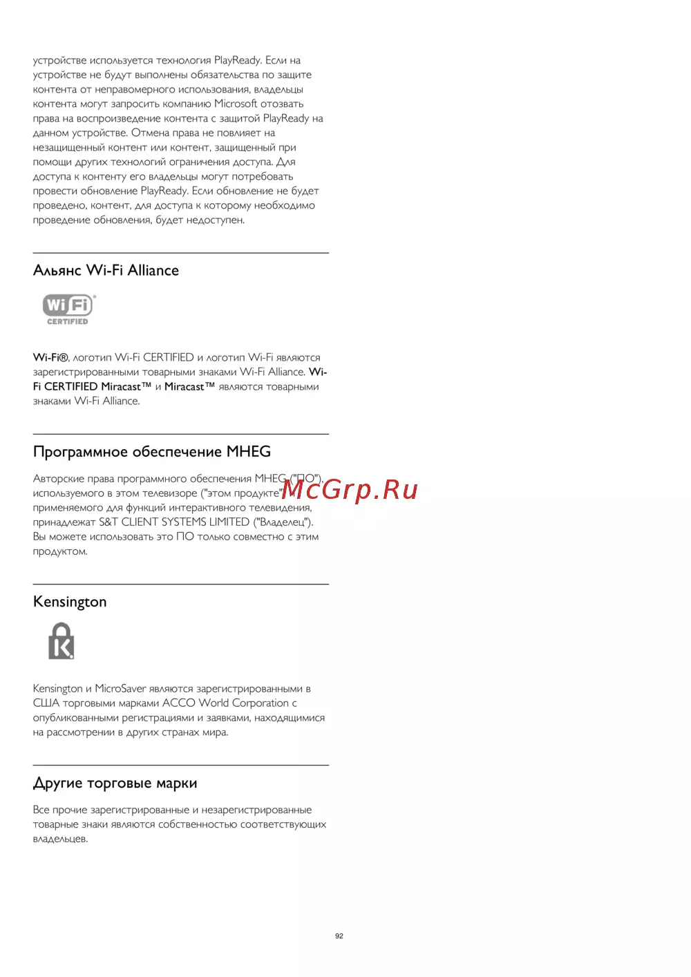 Информация о технологиях защиты контента PlayReady, условиях использования ПО MHEG, авторских правах и зарегистрированных товарных знаках Wi-Fi CERTIFIED, Kensington и MicroSaver.
