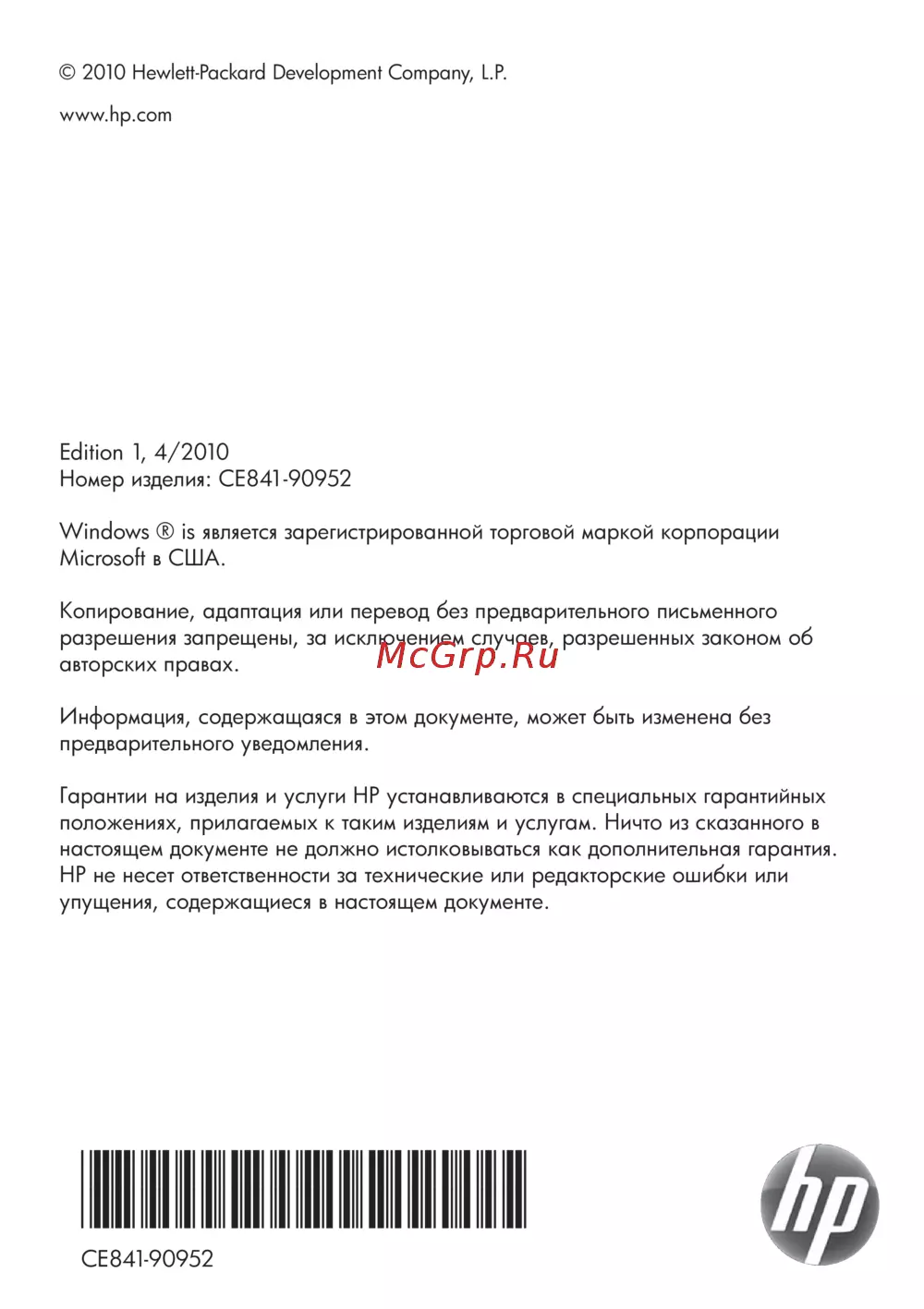 Гарантии на изделия и услуги HP устанавливаются в специальных гарантийных