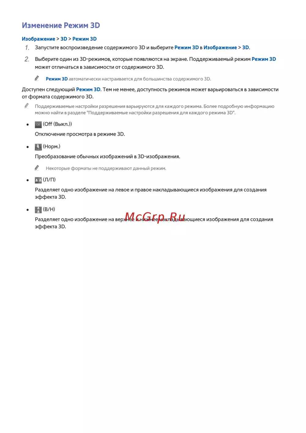Доступен следующий Режим 3D. Тем не менее, доступность режимов может варьироваться в зависимости
