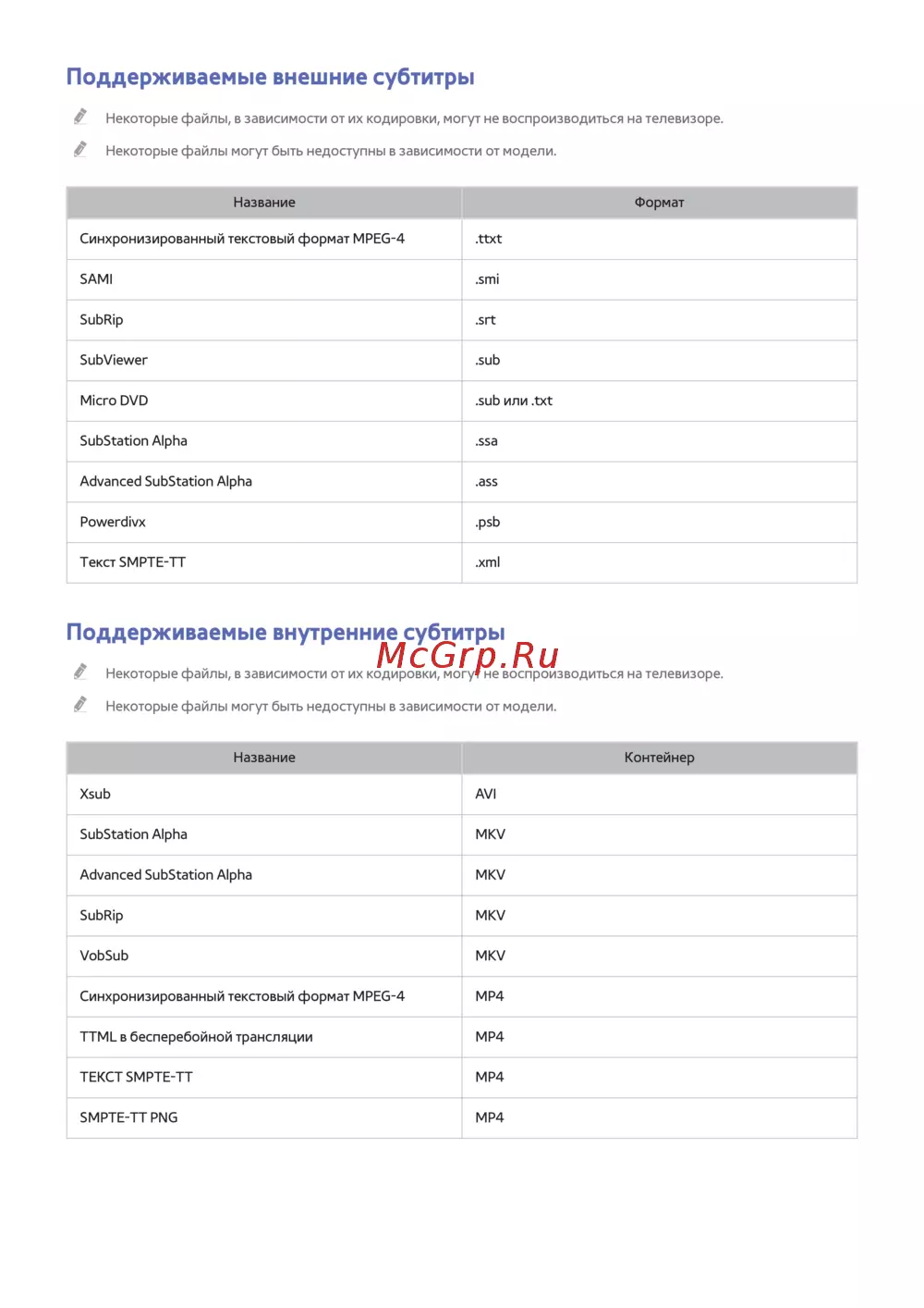 - Поддерживаемые внутренние субтитры p.151
