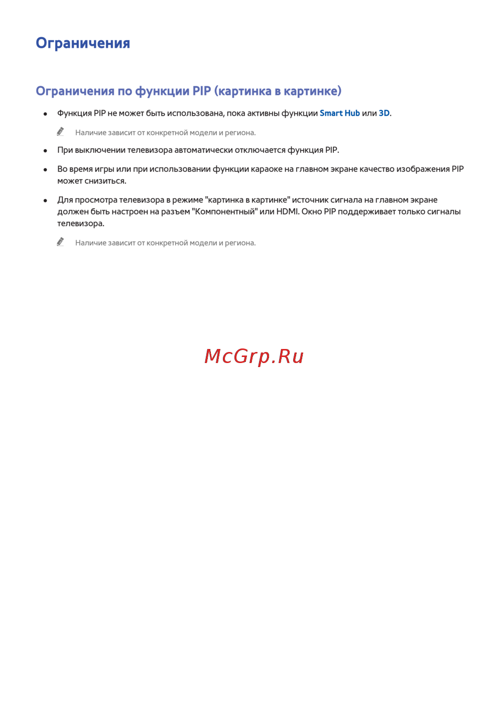 Функция PIP не может быть использована, пока активны функции Smart Hub или 3D.