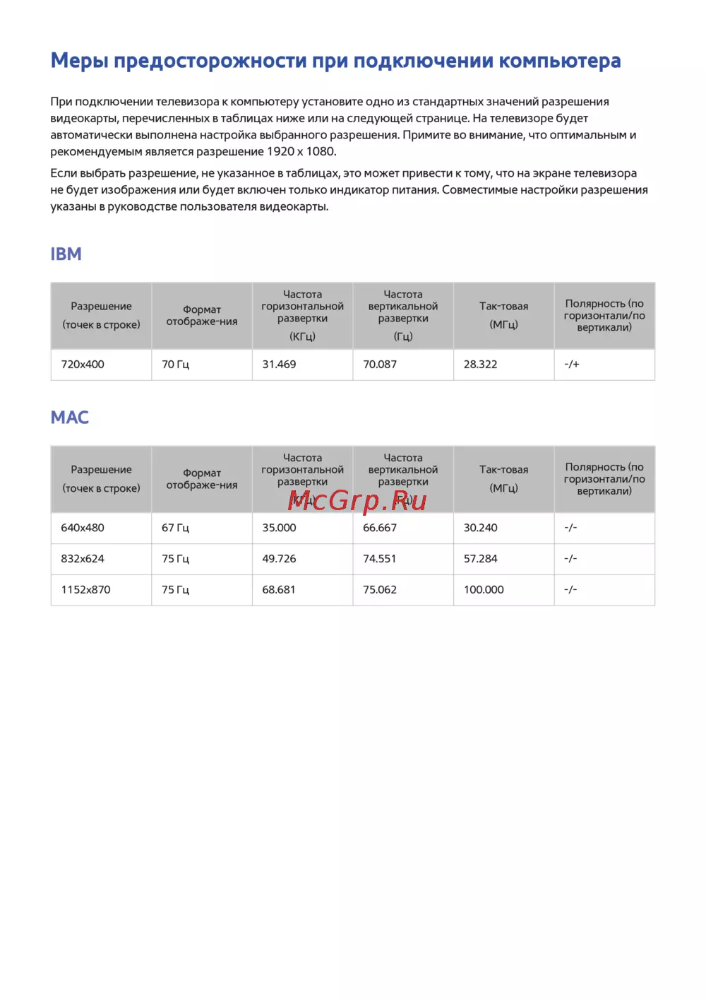 - Если выбрать разрешение не указанное в таблицах это может привести к тому что на экране телевизора не будет изображения или будет включен только индикатор питания совместимые настройки разрешения указаны в руководстве пользователя видеокарты p.158