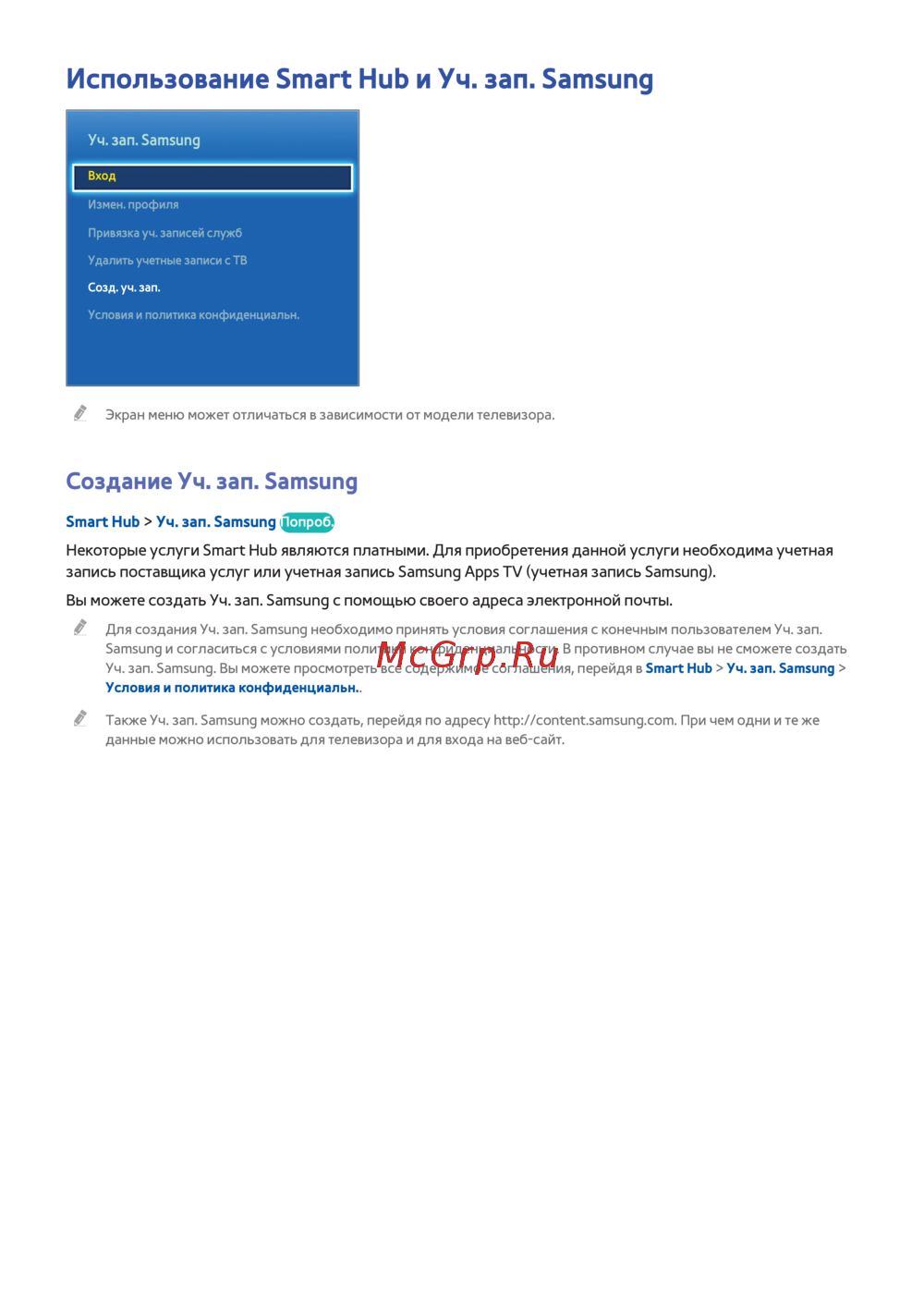Уч. зап. Samsung. Вы можете просмотреть все содержимое соглашения, перейдя в Smart Hub > Уч. зап. Samsung >